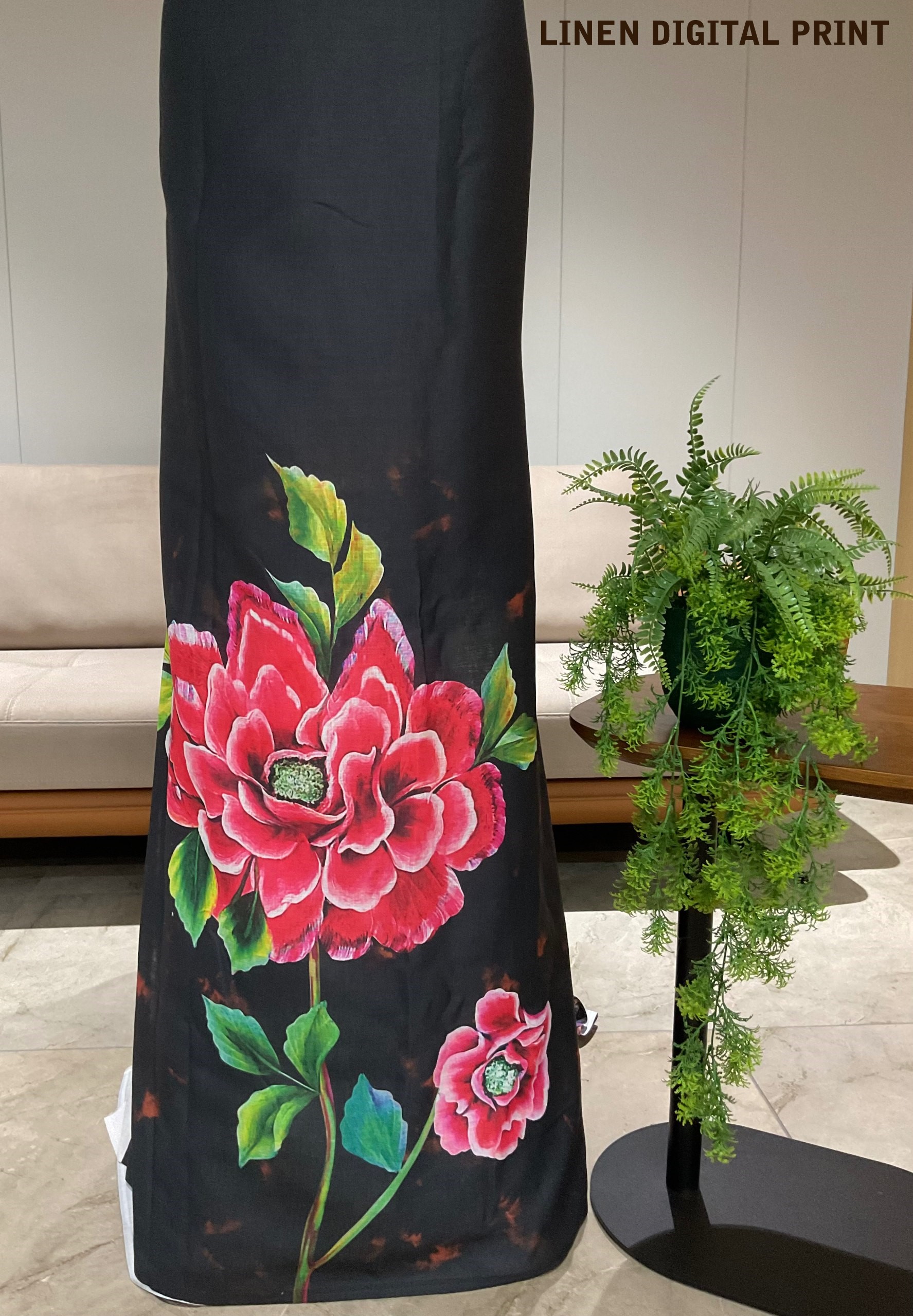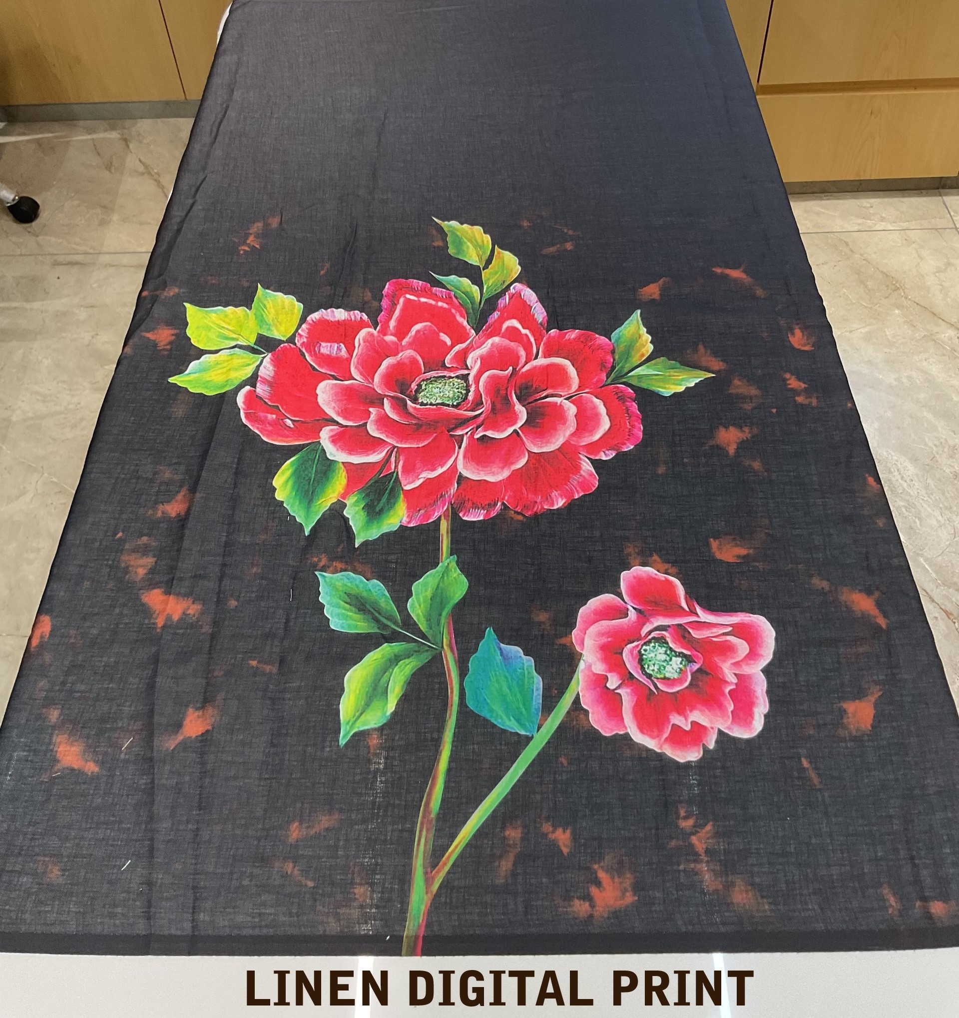 Elevate your fashion or home décor creations with our Floral Bloom Linen Digital Print. Crafted on premium quality linen, this fabric features a striking oversized red floral design digitally printed for maximum vibrancy and detail. The deep black background enhances the richness of the colors, making it ideal for statement pieces like sarees, dresses, curtains, or artistic panels. Soft to touch, breathable, and effortlessly elegant, this fabric brings a perfect blend of traditional charm and modern digital precision.